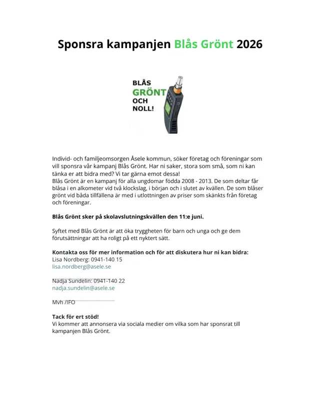 Individ- och familjeomsorgen Åsele kommun, söker företag och föreningar som vill sponsra vår kampanj Blås Grönt. Har ni saker, stora som små, som ni kan tänka er att bidra med?